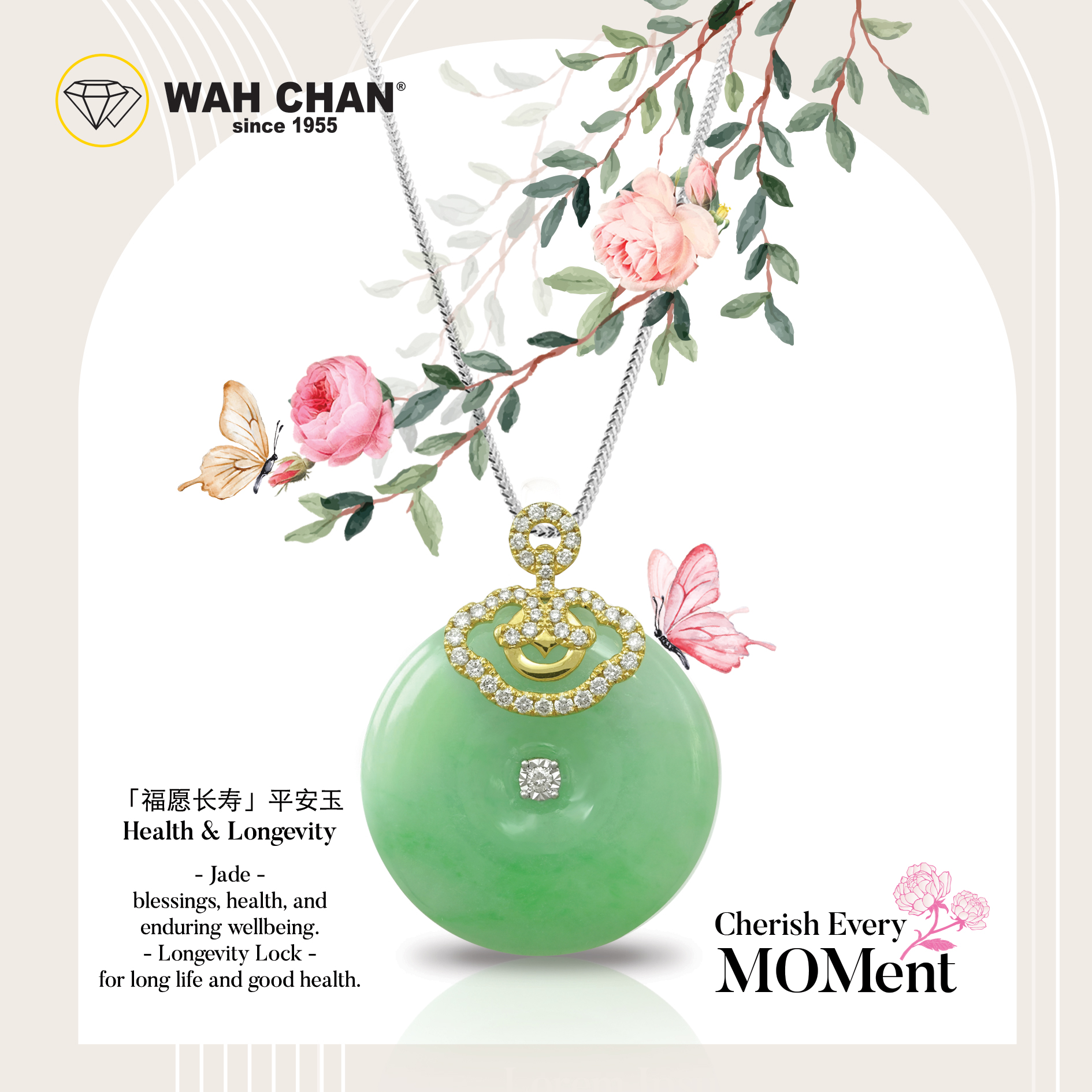 Celebrate every meaningful moment with the Wah Chan “Cherish Every MOMent” jade pendant, beautifully crafted to honour the heart of every mother. At its centre lies a luminous green jade, symbolising Health & Longevity (Longevity Lock) – a timeless symbol of lasting health, protection, and a long, fulfilling life. Thoughtfully designed with a refined touch, this meaningful piece is a timeless expression of love, gratitude, and the precious moments shared across generations.