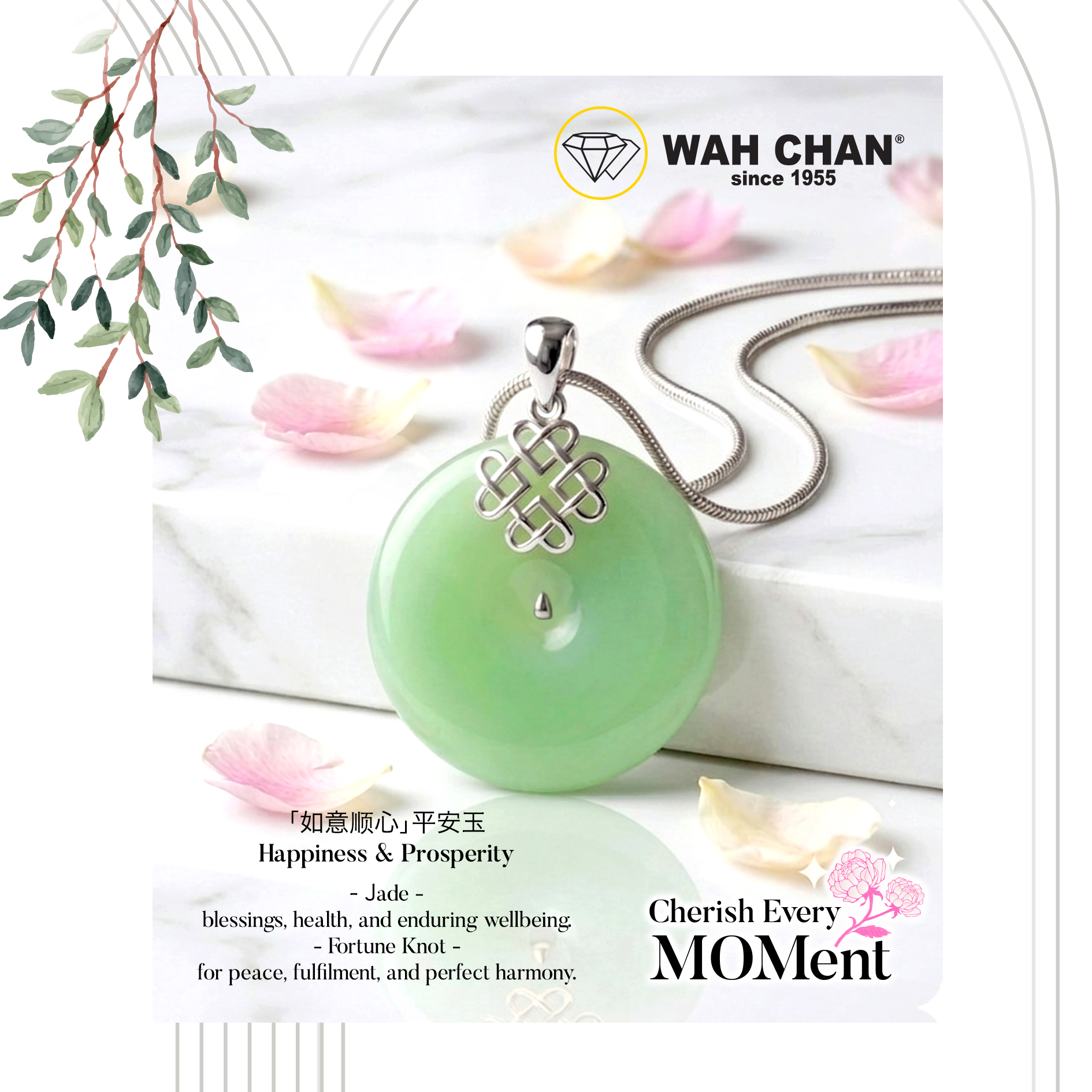 Celebrate every meaningful moment with the Wah Chan “Cherish Every MOMent” jade pendant, beautifully crafted to honour the heart of every mother. At its centre lies a luminous green jade, symbolising Happiness & Prosperity (Fortune Knot) – a graceful emblem of harmony, attracting happiness, success, and abundance. Thoughtfully designed with a refined touch, this meaningful piece is a timeless expression of love, gratitude, and the precious moments shared across generations.