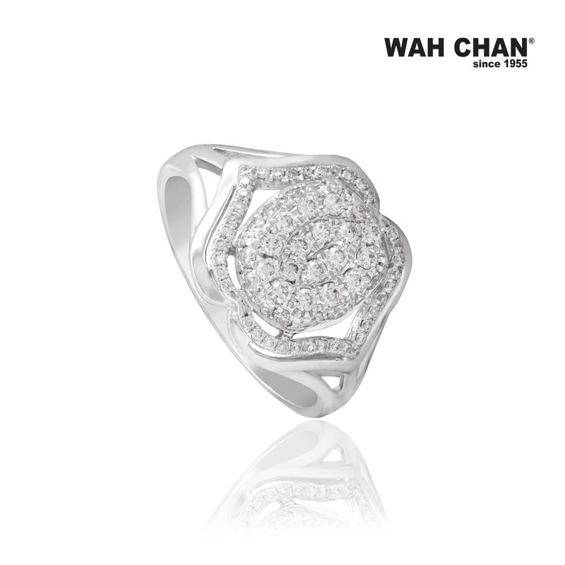 Radiating sophistication and artistry, the WAH CHAN White Gold Diamond Ring is a breathtaking expression of modern elegance. Crafted in luminous 9k white gold, this ring features a captivating cluster of diamonds arranged in a floral-inspired silhouette, framed by a soft, petal-like outline. The layered design creates depth and sparkle, making it an ideal piece to commemorate meaningful milestones. Whether gifted or worn as a personal treasure, it reflects the timeless craftsmanship and heartfelt beauty synonymous with Wah Chan.